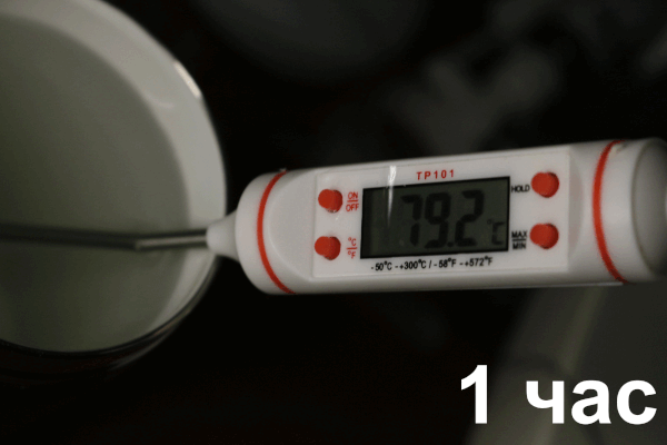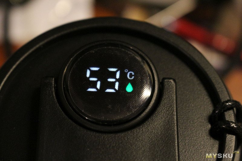 Также наверху крышки видно окошко сенсорного термометра — при касании он показывает текущую температуру жидкости.