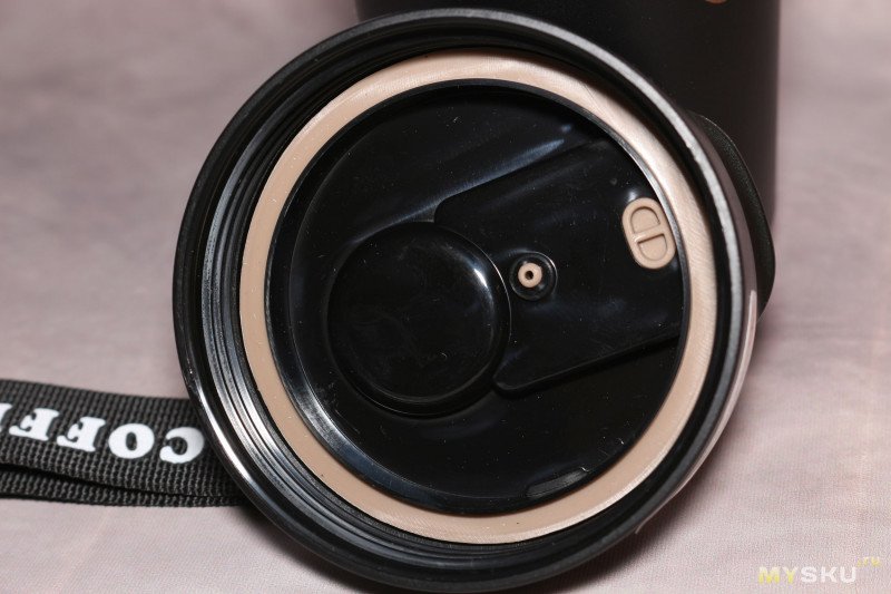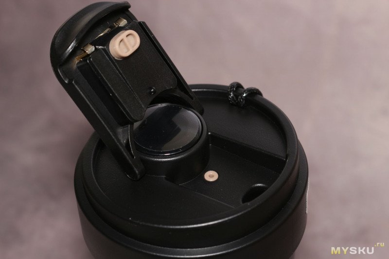 Крышка пластиковая, с силиконовыми уплотнителями по периметру и в районе отверстия для питья.