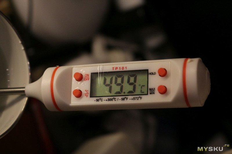 Термометр стабильно привирает на 3-4 градуса вверх. Зная эту особенность, легко понять реальную температуру. Также важно — термометр настроен так, что корректно работает (с учетом сказанного выше), когда жидкость его не касается. Если перевернуть кружку вверх дном, показания летят вверх.
