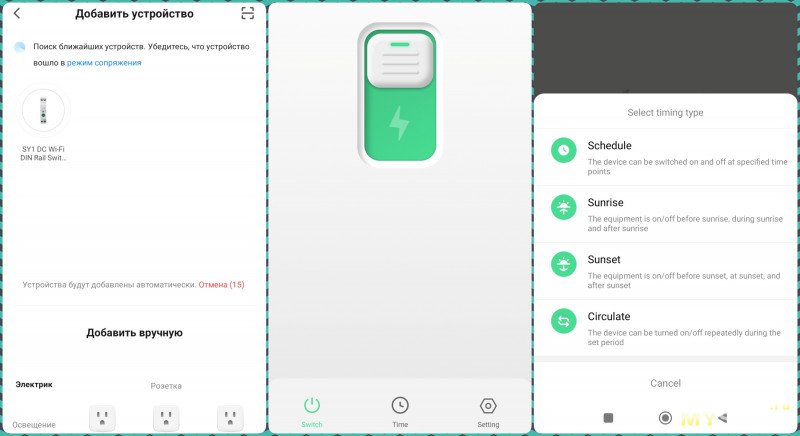 добавляем наше устройство (помним же, что телефон также должен быть подключен к 2.4ГГц), посредине большая кнопка вкл/выкл, таймеры