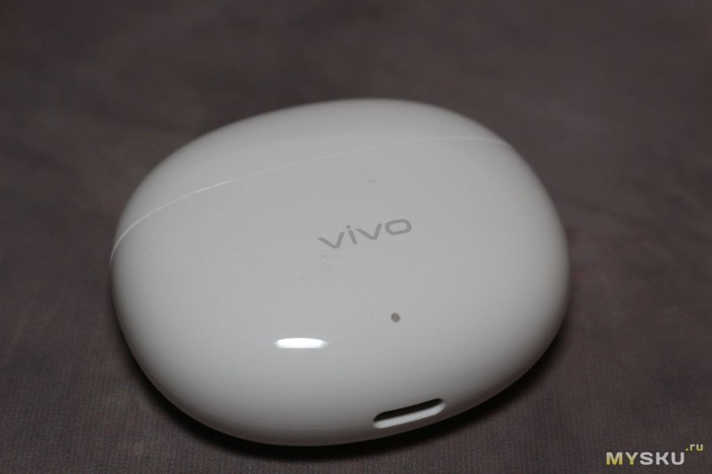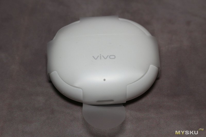 Кейс без дизайнерских изысков, но без вырвиглазной отсебятины — простой белый почти овал из глянцевого пластика (а вот синий, судя по фото, матовый), похож на камушек-гальку. На лицевой стороне нанесен логотип производителя и размещен глазок сервисного светодиода (в частности, он сигнализирует о разряде аккумулятора кейса при открывании/закрывании крышки — если загорелся не зеленым, а оранжевым, то заряда осталось 15%).