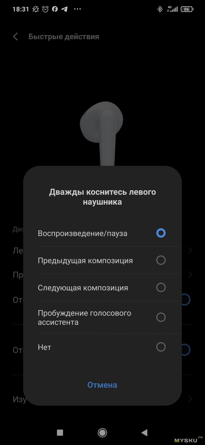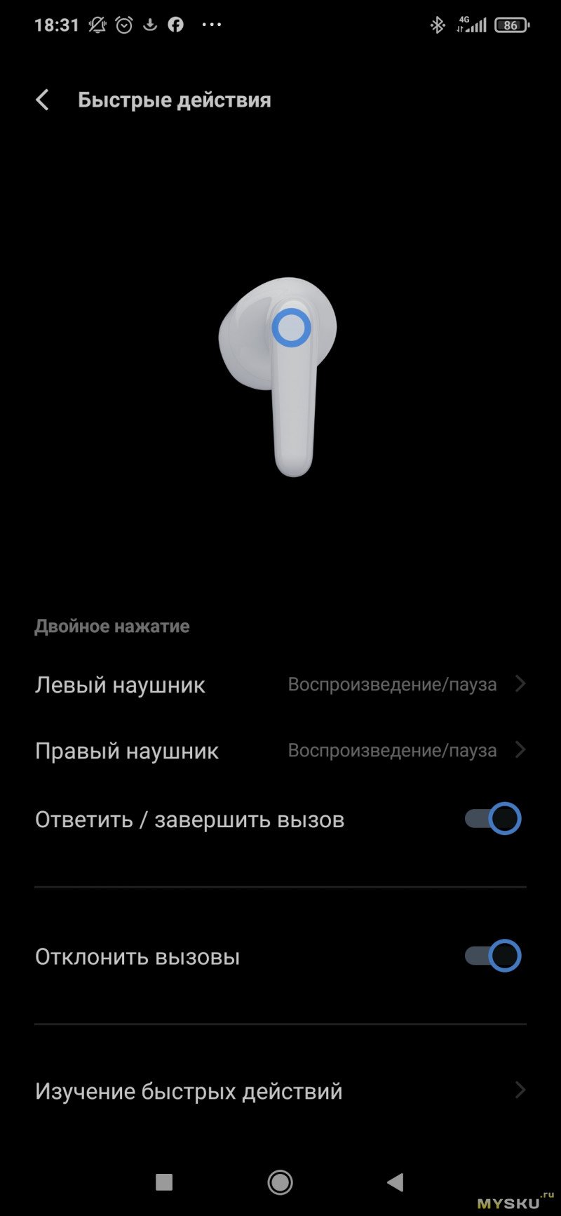 По управлению — оно неожиданное бедное. При звонке двойной тап по сенсорной зоне принимает звонок, длинное нажатие — сбрасывает. При воспроизведении гарнитура понимает только двойной тап — он ставит на паузу. В приложении можно выбрать другое действие — предыдущая/следующая композиция или вызов голосового ассистента. Поскольку можно выбирать действия для разных наушников, то максиму это, скажем, пауза на одном и следующая композиция — на другом. Повесить дополнительные действия на тройной тап и длинное нажатие производитель не догадался.