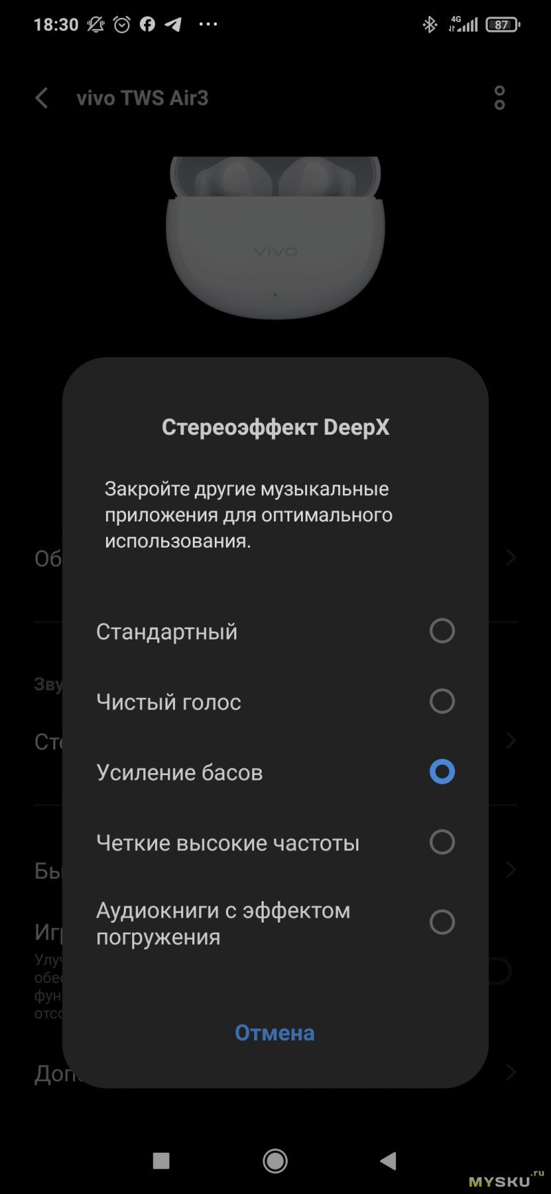 В наушниках заявлен 12-мм динамик, поэтому звук тоже довольно неплох. Это, конечно, не аудиофильское устройство, но удовольствие от прослушивания музыки через Vivo TWS Air3 все же можно получить — инструменты не сливаются в кашу, ничего не пилит и не свистит, все инструменты на месте. Она оговорка — в приложении стоит включить звуковой профиль Усиление баса. Он добавляет не столько количество нижних частот (это все же не внутриканальные наушники, и прямой передачи баса в ушной канал тут не добиться), сколько добавляет им объема и веса.
