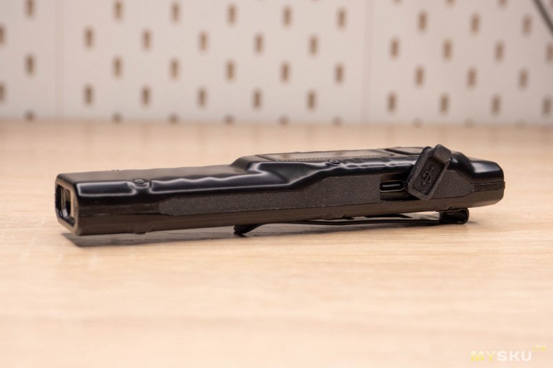 По бокам есть металлические вставки с накаткой для лучшей фиксации в руке. Справа под резиновой заглушкой спрятан Type-C разъем для зарядки.