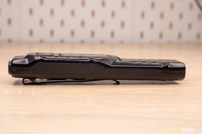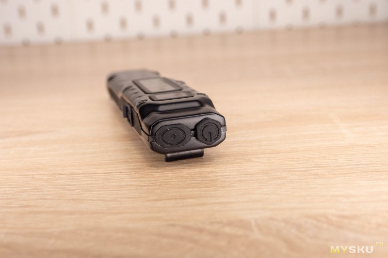 На лицевой стороне корпуса расположен небольшой дисплей и дополнительная панель с белыми, красными и УФ диодами. Окошки затемнены, за счет чего на черном корпусе эти вставки выглядят гармоничнее, но светопропускаемость будет малость снижена. С обратной стороны имеется клипса. Корпус металлический, магнит липнет только к винтам и клипсе.