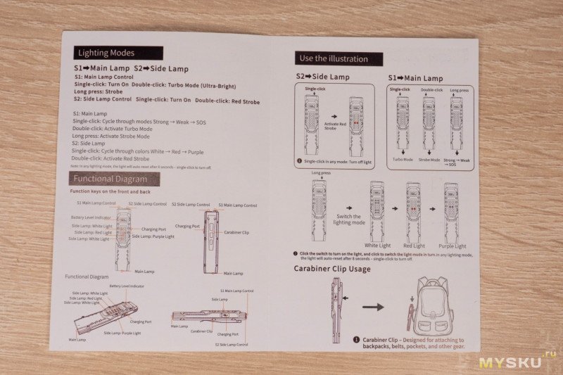 Режимы основного света: Сильный — Слабый — SOS; Двойное нажатие для Турбо-режима, Долгое нажатие для Стробоскопа