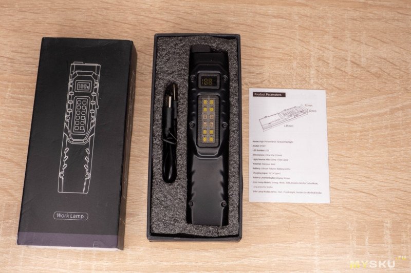 Поставляется в черной коробке, внутри имеется мягкая вставка. В комплекте фонарь, кабель Type-C для зарядки и макулатура.