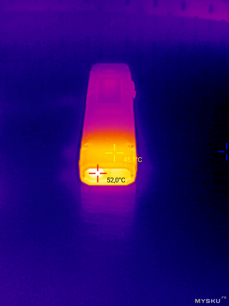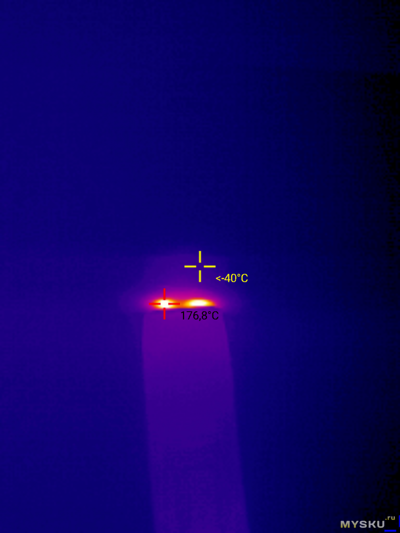 Судя по тепловизору, температура в точках воздействия была близкой к 200°C. Если убрать препятствие, оптика нагревается не так уж сильно, да и корпус хоть и становится ощутимо теплым спустя полминуты, но не обжигает руки.