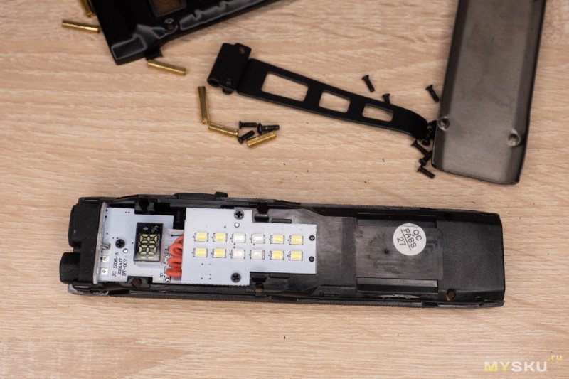 Чтобы понять насколько вредна такая мощность для светодиодов, было решено разобрать корпус, ведь без теплоотвода они быстро деградируют. Занятно, что корпус соединяется с помощью винтов и латунных вставок, которые просто входят в шестигранные отверстия внутренней конструкции. А еще с двустороннего скотча аккумулятора забыли снять защитную пленку, но благодаря этому удалось без проблем снять заднюю крышку. Похоже пластины действительно из нержавейки.