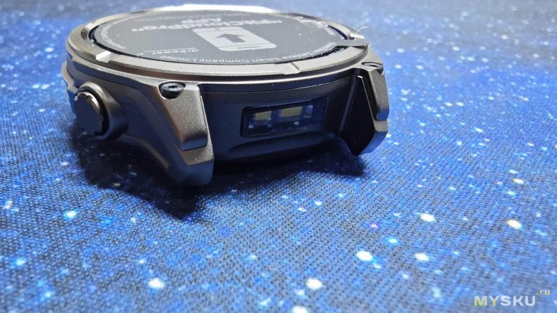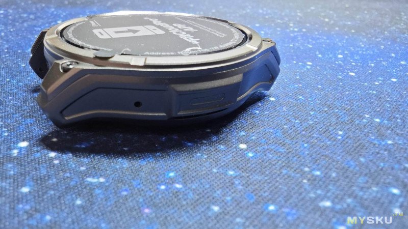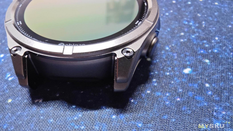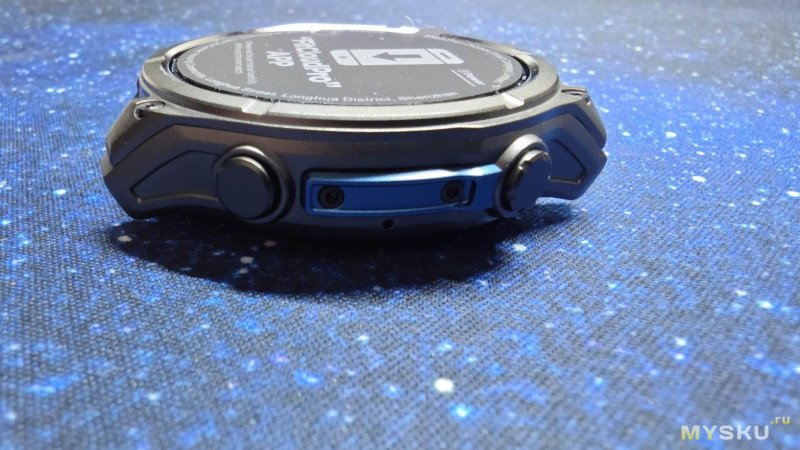 Сменная также синяя накладка между двух кнопок с правой стороны корпуса. Там винты еще меньше. Часы довольно толстенькие. Их толщина составляет почти 14 мм. Это плата за ёмкий аккумулятор — 500 мАч, обеспечивающий часам внушительную автономность. Как заверяет производитель, в режиме ожидания часы способны проработать до 40 дней, а при обычной эксплуатации до 18 дней. Обычно эти цифры приводят без учёта работы часов с включённым AOD. При его активации их можно смело делить на 2. В любом случае, если часы проработают с AOD больше недели, то это будет очень неплохо. Таким показателем не все дорогие часы могут похвастать.