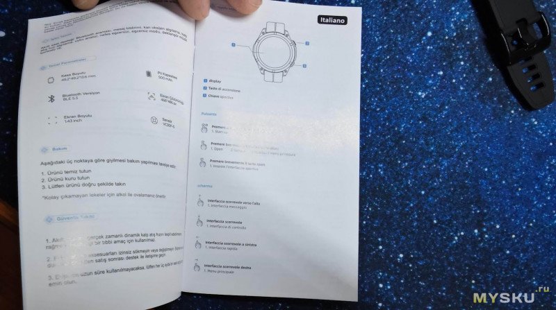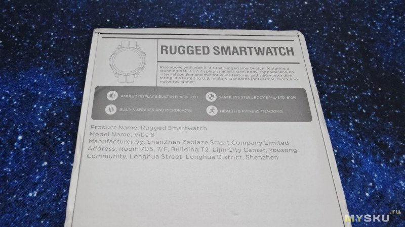 Поставляются часы в иллюстрированной коробке из плотного картона. На обратной стороне которой указаны ключевые характеристики. Из не названных мной в заголовке обзора: встроенные динамик с микрофоном, сапфировое стекло, возможность погружения на глубину до 50 метров, отслеживание состояния здоровья и физической формы.