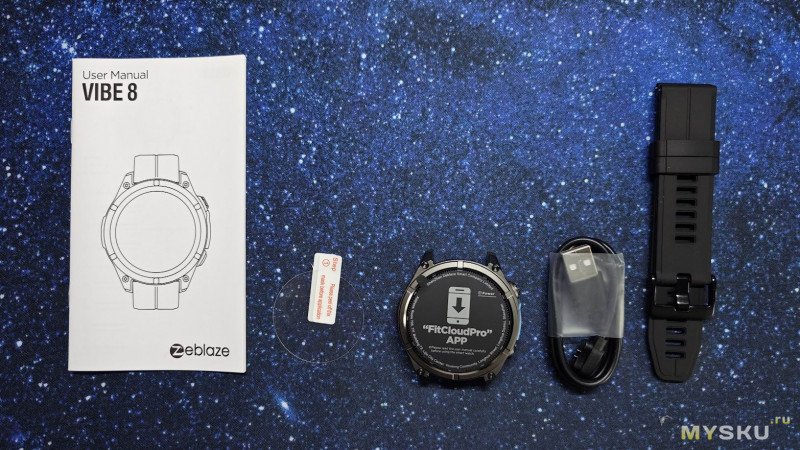 Комплект поставки включает в себя, помимо часов Zeblaze Vibe 8, ремешок, зарядный кабель, защитное стекло на экран, руководство пользователя.