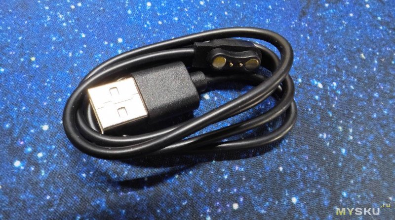 Кабель для зарядки имеет длину 60 см, разъём USB для подключения к стандартному блоку питания и 2-х пиновый контакт с магнитным креплением.