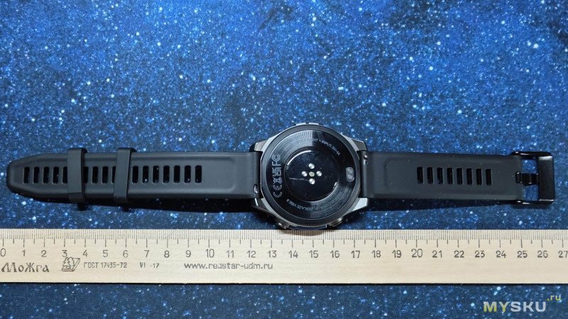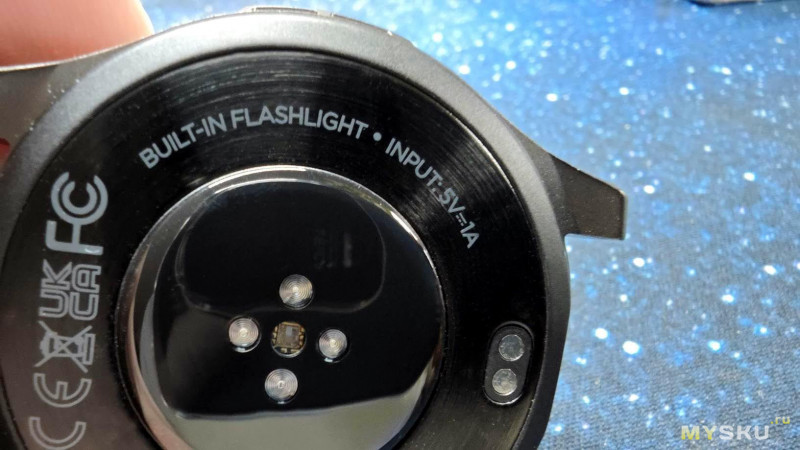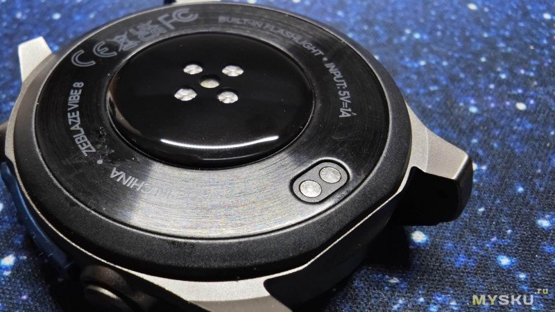С обратной стороны корпуса в центре находится чуть выпуклый модуль с набором датчиков для отслеживания физической активности и здоровья, включая пульсометр, датчик кислорода в крови, датчик приближения и акселерометр. Ниже расположен двух-контактный разъем для магнитной зарядки с параметрами 5 В 1 А. Задняя крышка также металлическая.