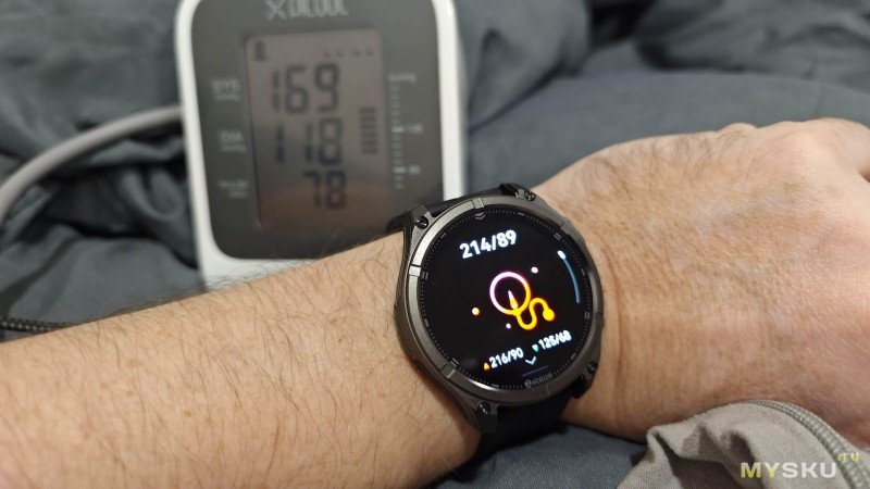 Что-то в этом плане часы всё же измеряют, но очень уж не точно. Да и вообще сам метод простого просвечивания кожных покровов для измерения артериального давления вызывает вопросы. С чем хорошо, так это с защитой от дурака — измерить давление у палки колбасы часы не дадут, они понимают, что часы не надеты на руку.