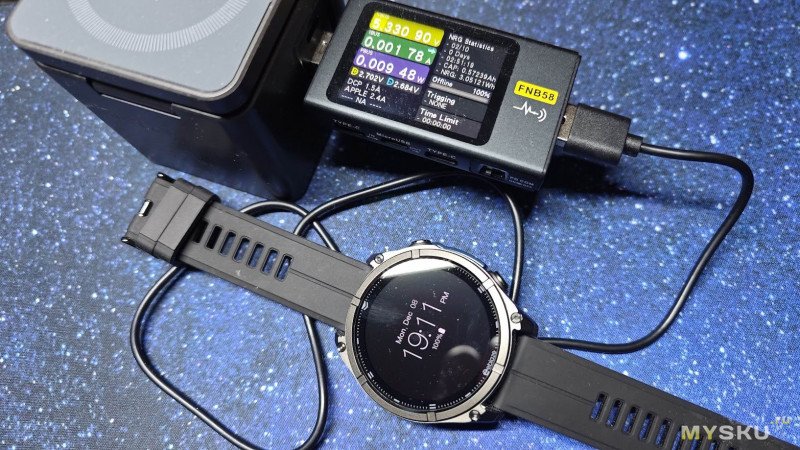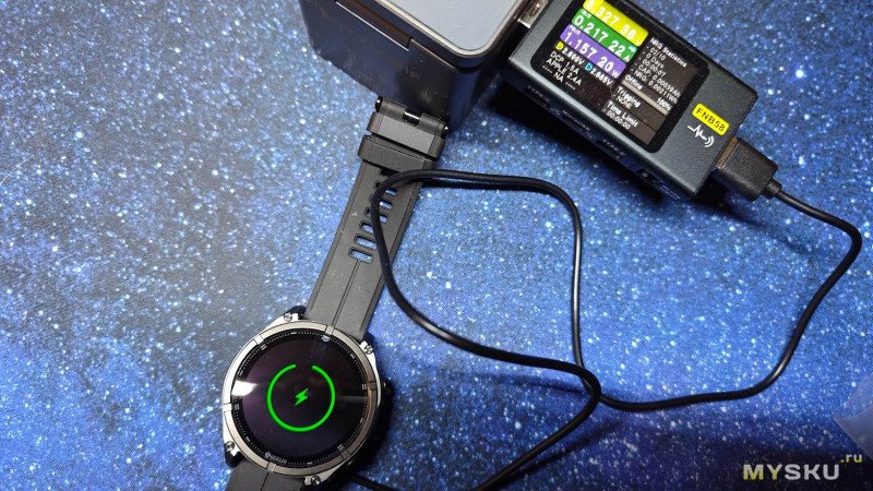 Заряжаются часы сначала током чуть больше 0,2 А, потом он падает. На полную зарядку аккумулятора ушло почти 3 часа. Накопленная ёмкость составила 571 мАч — всё как обещано.