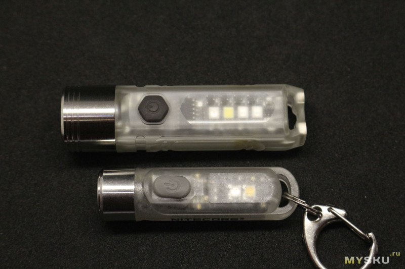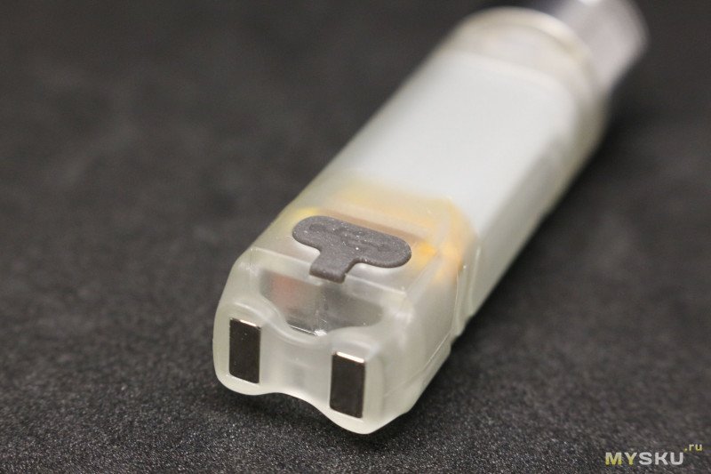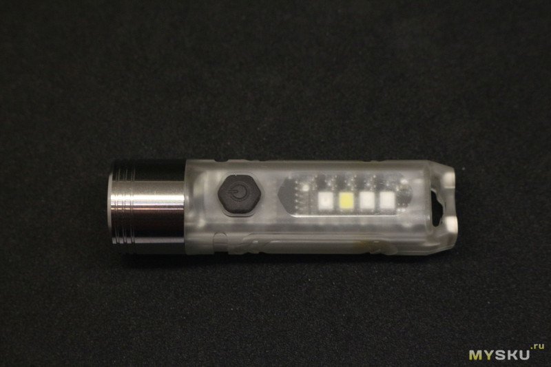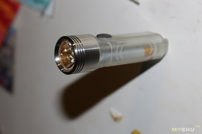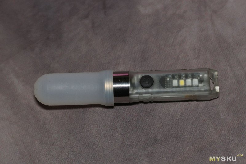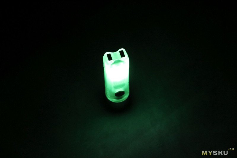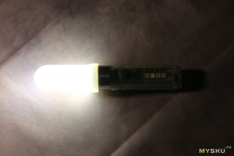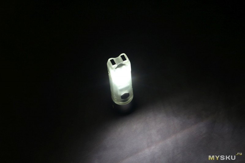 Тройное нажатие включает боковой свет, переключение режимов также единичным кликом. В наличии: белый свет, белая моргалка, УФ, синий, красный, красная моргалка, красно-синяя моргалка. Белый свет вполне подходит на роль ночника. УФ годится чисто для зарядки люминофора.