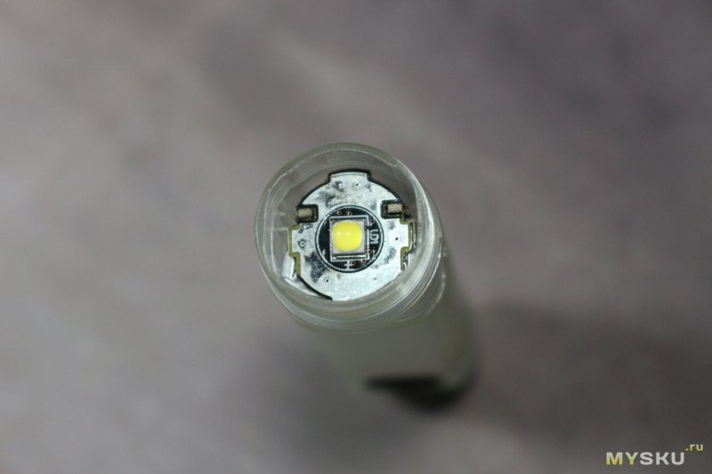 Голова фонаря свободно откручивается, давая доступ к внутреннему миру. Есть силиконовые уплотнительные кольца между головой и линзой, а также на резьбе корпуса. И латунная пилюля для отвода тепла от светодиода; но термопаста между пилюлей и звездой не помешала бы. Плату и аккумулятор я лишний раз не вытягивал — через корпус и так видно, что где.