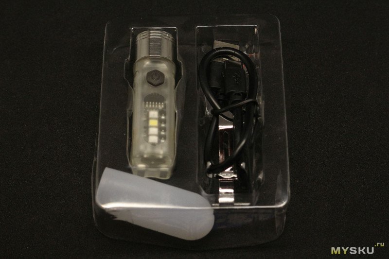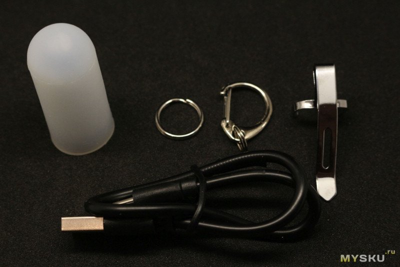 Комплект: фонарь, рассеиватель, кольцо и карабин для ключей, клипса, зарядный шнур.