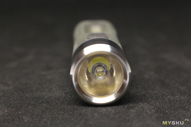 Управляется фонарь одной кнопкой. Кнопка достаточно тугая, но все равно жаль, что блокировка не предусмотрена.Удержание кнопки включает турбо режим, фонарь работает пока кнопка нажата. Двойной клик активирует основной свет, переключение режимов производится короткими нажатиями, длинное нажатие выключает фонарь. Память режимов есть.