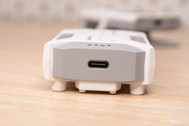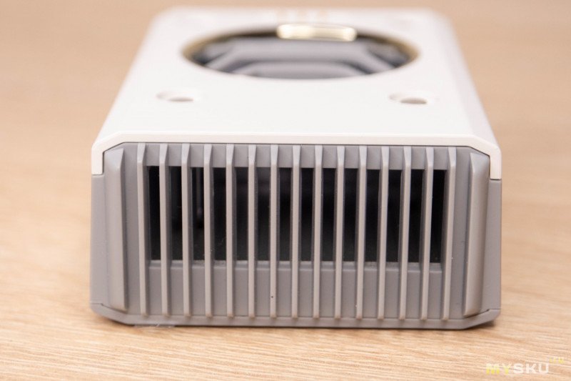 В нижней части видны две кнопки управления и разъем питания Type-C. После охлаждения радиатора, теплый воздух выходит через верхние вентиляционные отверстия.