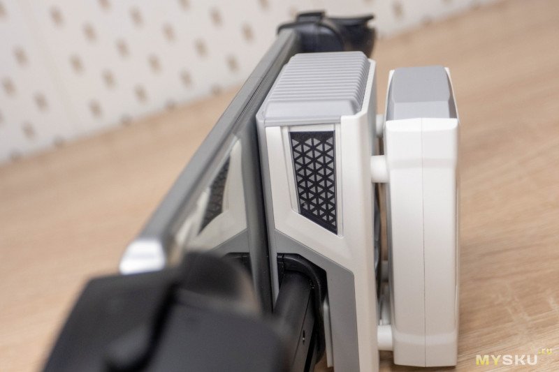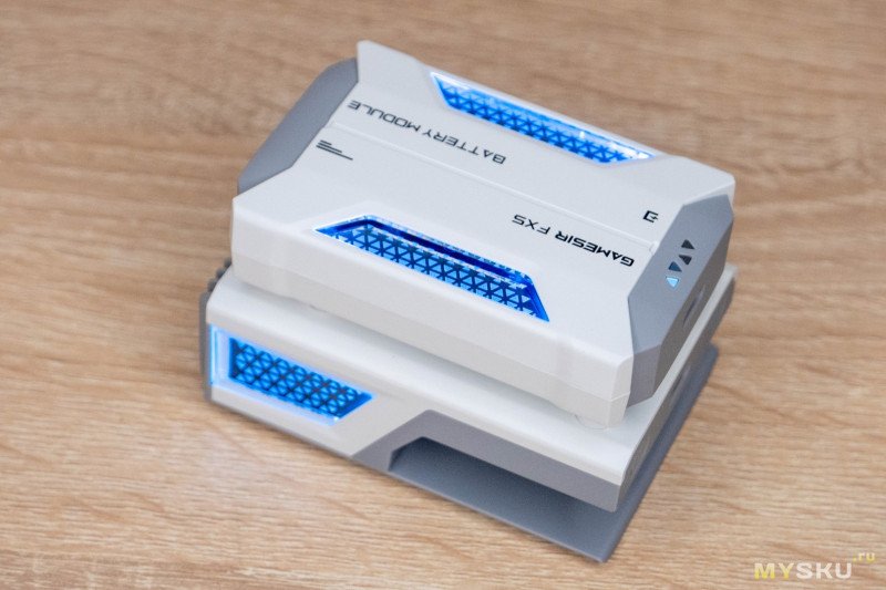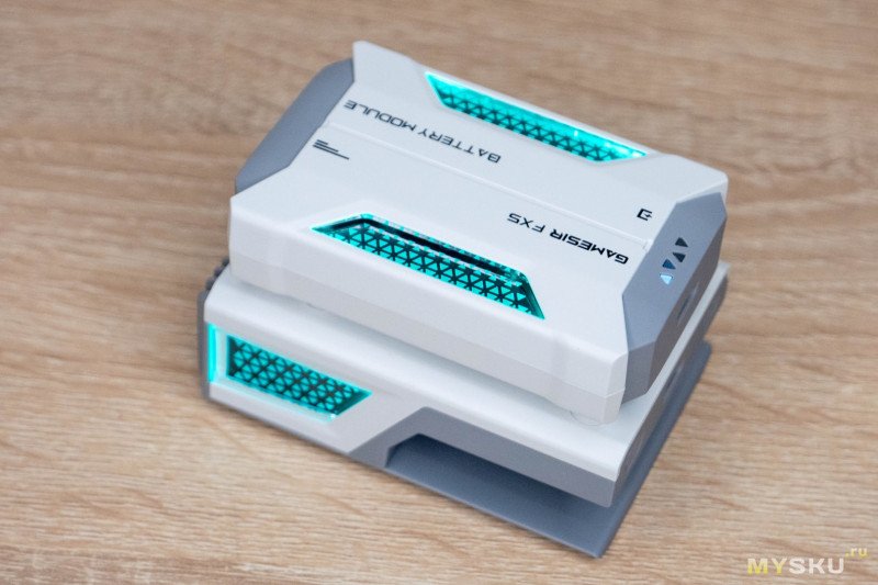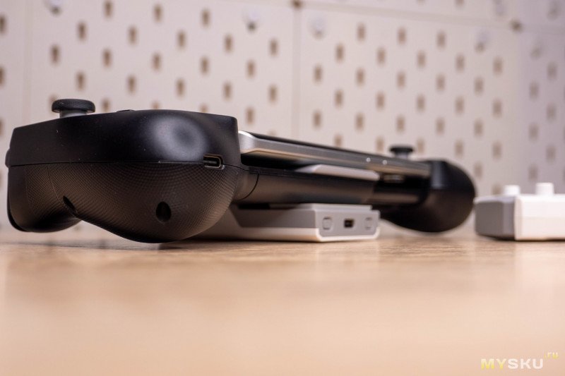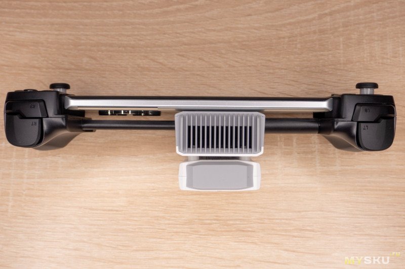 А вот с размерами корпуса как будто немного просчитались. Если положить геймпад на ручки, они не достают до поверхности стола и красивый белый кулер будет царапаться при такой эксплуатации. Правда при установке аккумулятора сборку можно ставить вертикально, но всё же.
