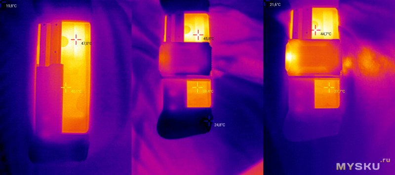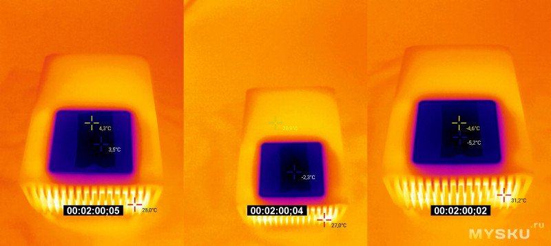 Ну а так грелся корпус. Без охлаждения максимальная температура достигала 40-47°C, с минимальным принудительным охлаждением снизилась до 39.4-45.8°C и с максимальным до 37.7-44.7°C. При этом зона с максимумом сместилась к хромированному ободку камеры, так что возможно последнее измерение было не совсем корректным. Тактильно экран казался заметно прохладнее, но измерять температуру стекла несколько проблемно.