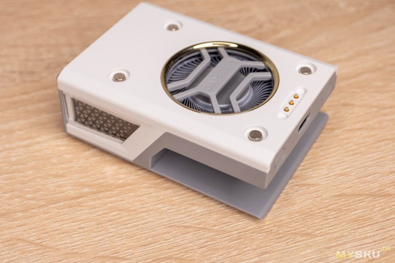 На лицевой стороне кулера расположено вентиляционное отверстие для забора воздуха, три контакта для подключения батарейного модуля и четыре магнита для его надежной фиксации. С обратной стороны находится металлическая пластина размером 25х25мм, которая и будет охлаждать корпус телефона.