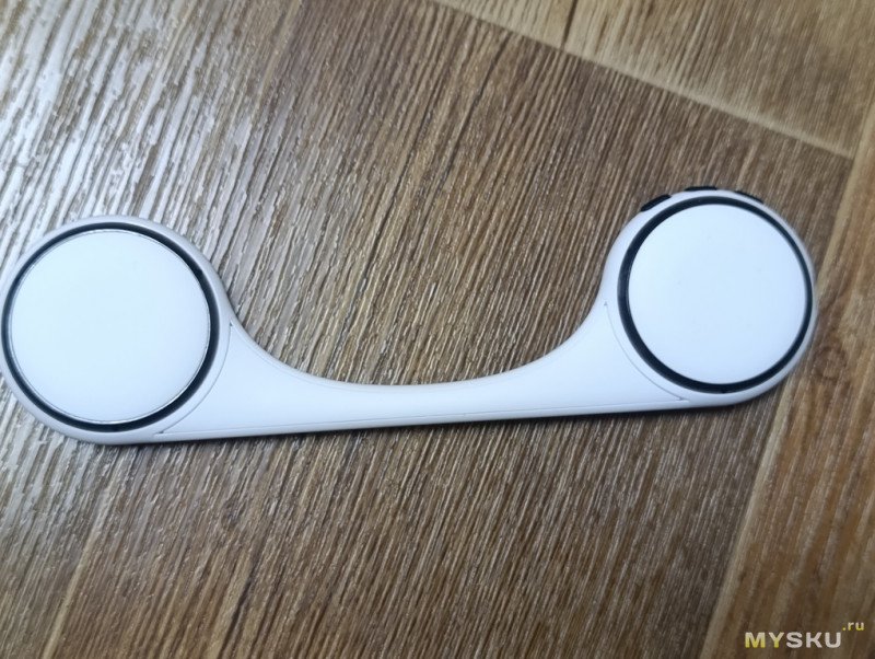 Мини колонка небольшого размера: Д164мм, Ш46мм, В9мм. Перемычка между излучателями из гибкого пластика. Сами излучатели и их рабочая сторона находятся под белыми дисками с кольцевой окантовкой.