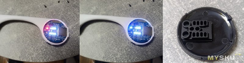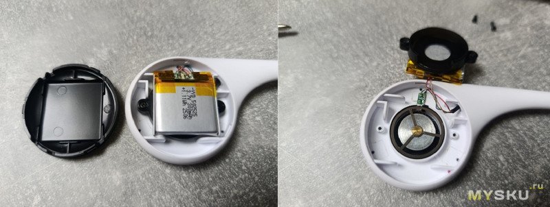 Открываются только темные крышки. Под левой расположен аккум на 300 мАч и излучатель. Аккум намертво приклеен к фиксирующей крышке излучателя.