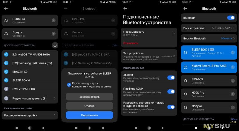 Подключение колонки производится при первом включении, должен мигать красный-синий индикатор, либо зажать кнопку вкл на 3 сек и активируется режим подключения BT. Находим в BT настройках телефона гаджет под именем «SLEEP BOX 4», даем разрешения и колонка тут же подключается и появляется в подключенных устройствах.
