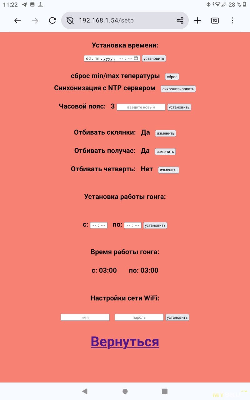 Меню и другие настройкиПосле того как успешно подключились к WiFi, можно переходить к настройке самих часов: