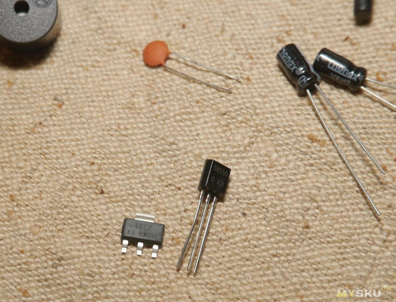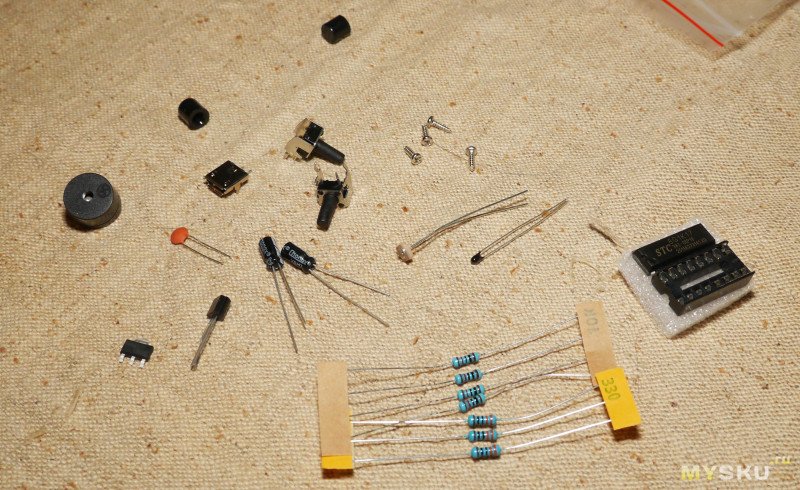 Также в комплект положили небольшой пакет с парой конденсаторов, 7 резисторами, парой кнопок и еще кое-чем по мелочи.