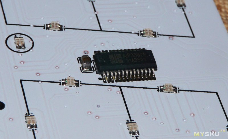 Также на плате установлено два контроллера светодиодных матриц AiP3328. Даташит на сию зверушку я смог найти только у китайцев, но сама по себе микросхема интересная: цифровое управление, каскадирование, поддержка ШИМ индивидуально для каждого светодиода до 256 уровней и некоторые другие плюшки.