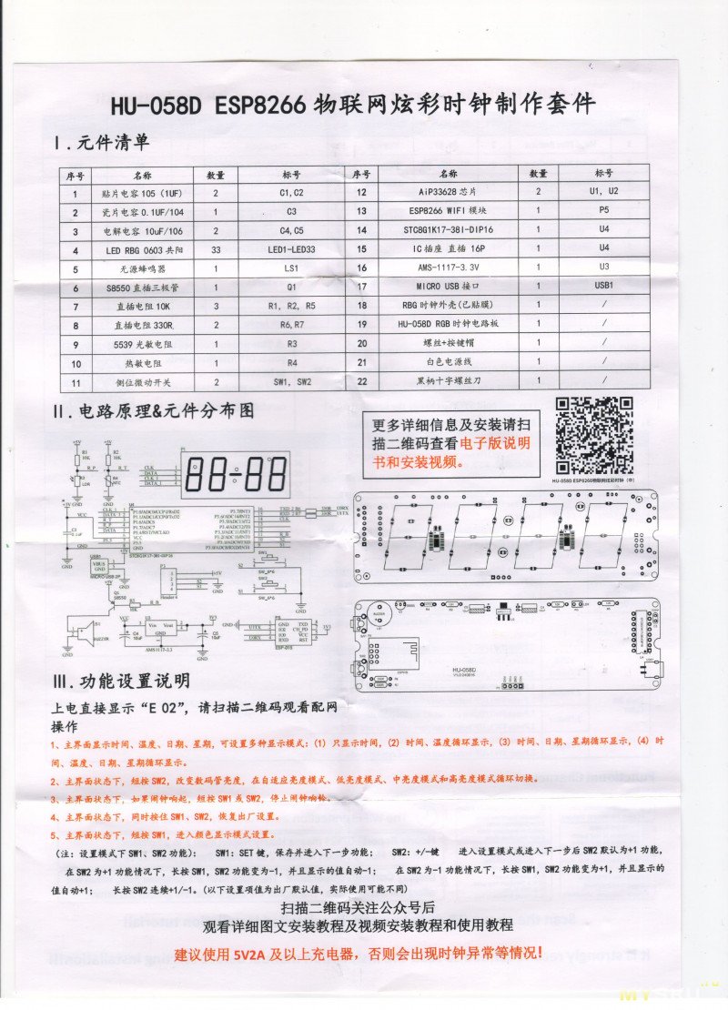 После вскрытия нас встречает инструкция на китайском и английском, там же есть принципиальная схема часов и QR-код, ведущий на страницу разработчика, где есть видеоинструкция по сборке.