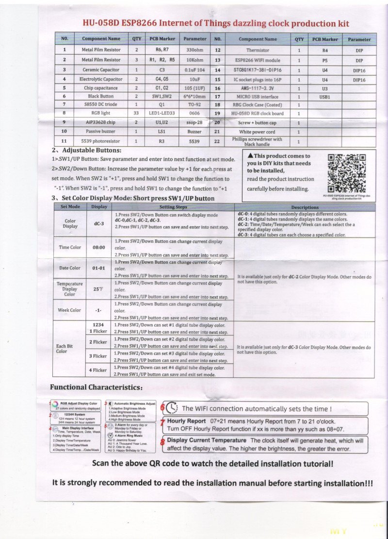 После вскрытия нас встречает инструкция на китайском и английском, там же есть принципиальная схема часов и QR-код, ведущий на страницу разработчика, где есть видеоинструкция по сборке.Инструкция