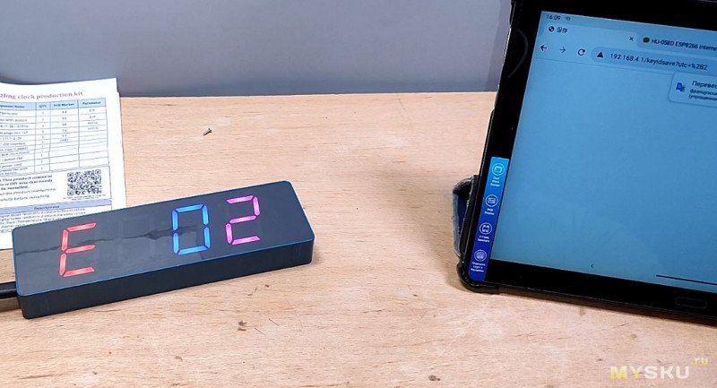 После первого включения на дисплее отображается надпись Е 02 и часы ожидают подключения к WiFi.