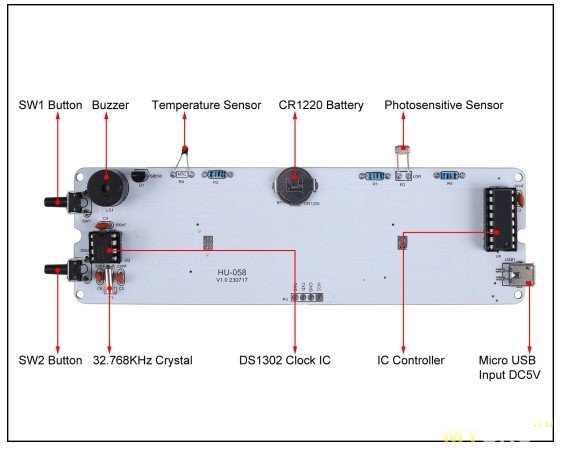 Поискав по коду набора HU-058D в сети, нагуглил набор HU-058 на точно такой же плате, с точно таким же STC-контроллером, но там на месте ESP-модуля стоит микросхема часов DS1302.