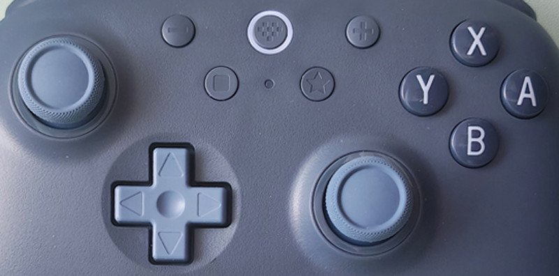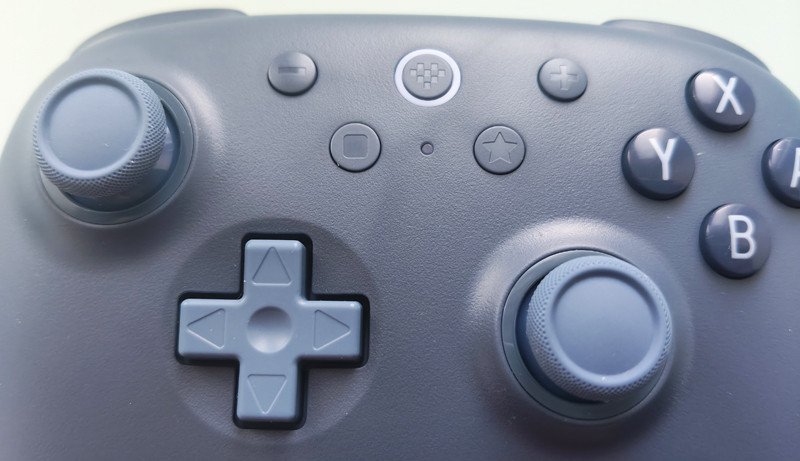 Раскладка контроллера для Nintendo Switch. Кнопки нажимаются приятно, не громкие. Кнопка «Home» расположена сверху и подсвечивается. Звездочка нужна для программирования кнопок. Крестовина схожа с контроллерами Super Nintendo, но более точная, хорошо подходящая для ретро игр.