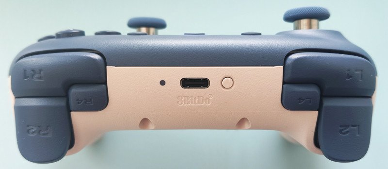 Сверху контроллера кликающие бамперы L1, L4, R1, R4, по ощущениям схожие с нажатием мышки, вероятно на микро переключателях, не шумные. Тригеры цифровые (либо 0, либо 100%), ход небольшой, мембранные. Также расположен порт type c и кнопка спаривания контроллера.
