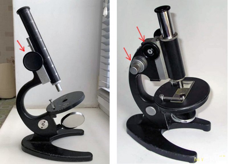Руками точно удержать можно лишь для увеличений до 10...20x, а дальше только механика. У простых «школьных» микроскопов с увеличением до нескольких десятков, только один механизм подачи. А более серьезные имеют дополнительный механизм точной регулировки, диапазон перемещения которого доли мм, а точность в микроны. На фото (взяты в сети) слева простой школьный микроскоп, справа — профессиональный с возможностью большого увеличения. Ручки грубой и точной регулировки показаны стрелками.