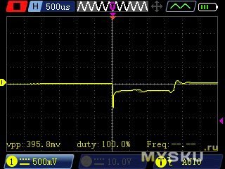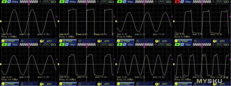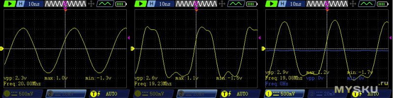 Вот 20МГц. обратите внимание на последний скриншот — это я переключил осцилл в двухканальный режим, и сразу прямоугольник стал некрасивым синусом.