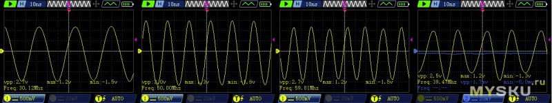 А вот двоюродные щупы и частоты близкие к максимальным для моего генератора. последняя картинка — это 60МГц но с включенным вторым каналом