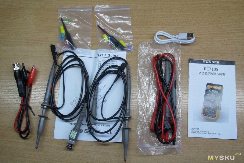 В нем — сам прибор, пара осциллографических щупов с комплектухой и инструкцией, пара щупов для мультиметра, кабель с крокодилами для генератора и USB кабель A-C длиной полметра, без линий данных, то есть только для зарядки, что крайне странно ибо прибор подключается к компу