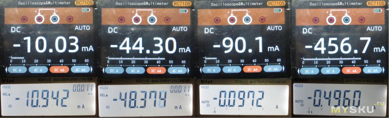 Потребляемый ток при 80% яркости подсветки составил 200мА для мультиметра, 270мА для осциллографа и 370 если включить еще и генератор.