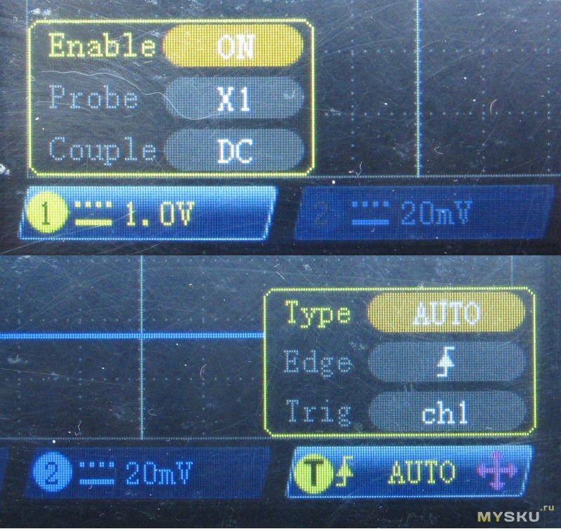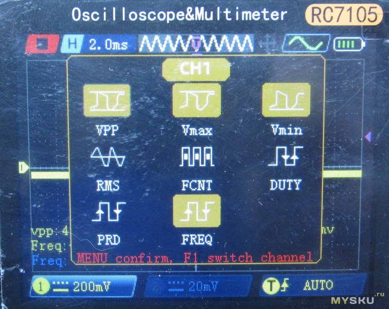 Управление. Тут тоже своеобразненько. F1 и F2 отвечают за 1 и второй каналы. Короткое нажатие — выбор канала, кнопками вверх-вниз выбираем вольты на клетку (20мВ-10В), вправо-влево — время на клетку (10нс-20с). Повторное нажатие вызывает символ стрелочки и позволяет двигать луч по экрану. Кнопка F3 управляет триггером. По короткому нажатию можно подвигать уровень. А вот длинное нажатие на F1-F3 вызывают меню где можно для каналов выбрать вкл/выкл, х1/х10, AC/DC, а для триггера auto/normal/single, передний/задний фронт и канал. Кнопка F4 отвечает за курсорные измерения — переключает между линиями и позволяет их подвигать