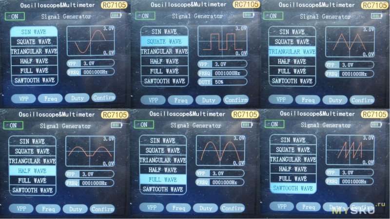 Забавное: включить/выключить выход генератора из меню генератора нельзя. Ну или я не нашел как. Только из меню в режиме осциллографа. Еще один интересный нюанс — генератор не работает в режиме мультиметра. А в режиме осциллографа — работает. Ну и третий, до кучи, кнопки в этом режиме срабатывают через раз почти всегда. То есть чтобы из трёх вольт сделать два — нужно как правило два раза нажать вниз.