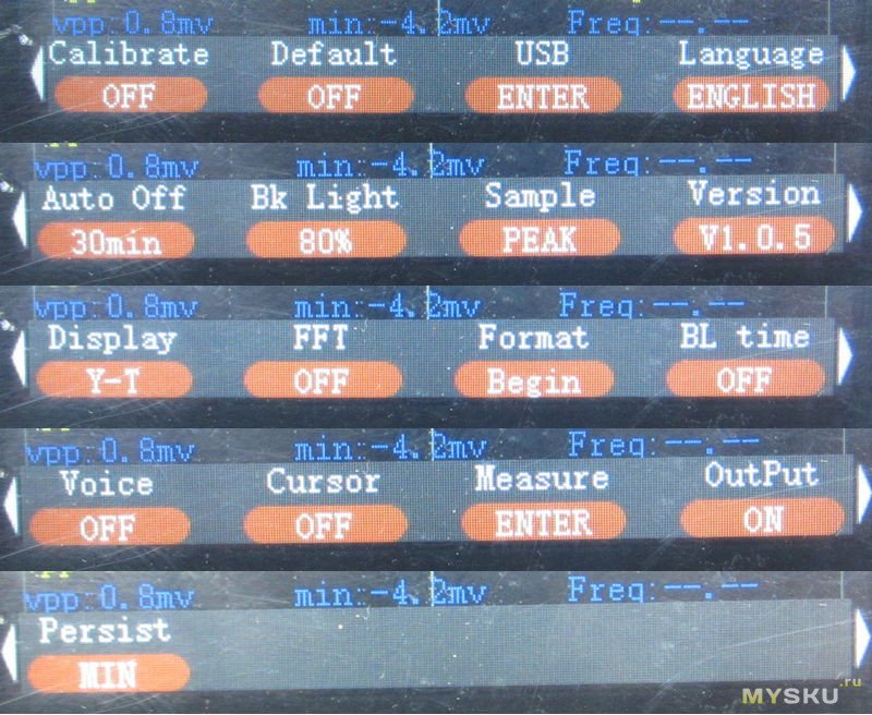 Как минимум меню тут побогаче. Из интересного — Voice всего лишь громкость, output — вкл/выкл генератора, persist — послесвечение, min/500ms/1s/10s/int, ну а как работает sample в вариантах peak и hd надо бы почитать в инструкции…