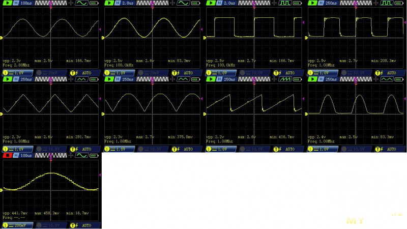 Ну и я пожалуй сразу сюда вставлю осциллограммы с генератора. я б сказал что для встроенного генератора всё нормально. ступенчатость закономерно тоже наблюдается, потому что никакого выходного делителя у него нет