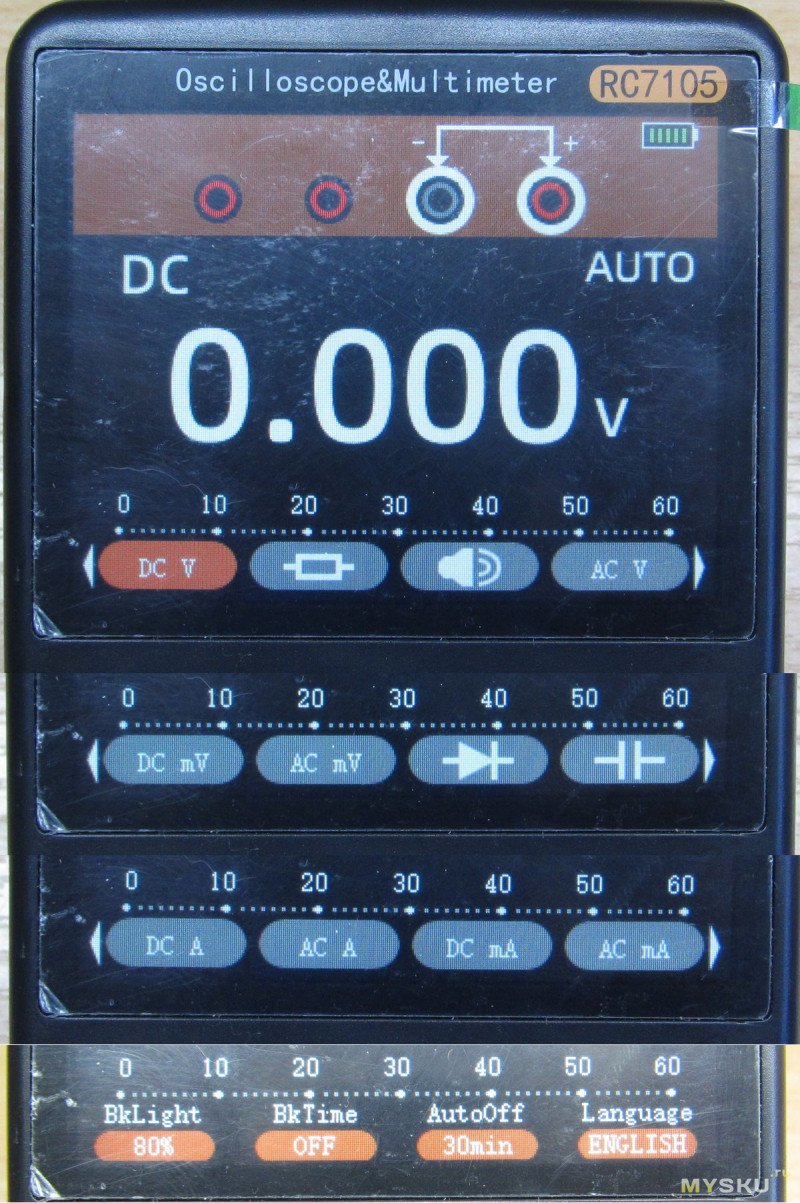 Экран режима мультиметра. В нижней части режимы работы переключаемые кнопками F1-F4, а кнопками вправо-влево меняются страницы с режимами, их три. По кнопке меню вызывается довольно скромное меню. Режимы при переключении на осциллограф и обратно не запоминаются — по умолчанию всегда VDC — благо хоть мультиметр/осциллограф при выключении прибора запоминаются. Удивило что AC и DC на разных кнопках. В верхней части экрана напоминалочка по гнездам. Было бы приятно видеть и светодиодную индикацию неправильного включения на самих гнездах, но я прекрасно понимаю что это дорого. Настройки яркости, времени свечения подсветки и автоотключения одинаковы для всех режимов. Языков два — китайский и английский.